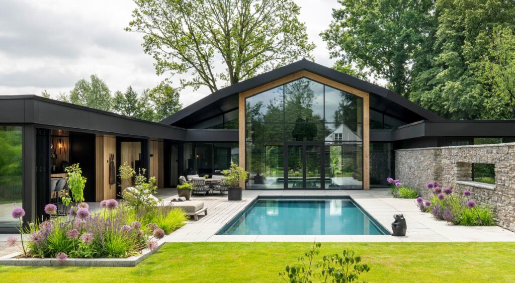 In dit ontwerp is een rustige, moderne tuin gecreëerd die perfect aansluit bij de uitgesproken landelijke Scandinavische stijl van de woning. Het gebruik van siergrassen en bloemrijke accenten brengt luchtigheid en beweging, terwijl de strakke lijnen rondom het zwembad en het poolhouse zorgen voor een solide en moderne basis.